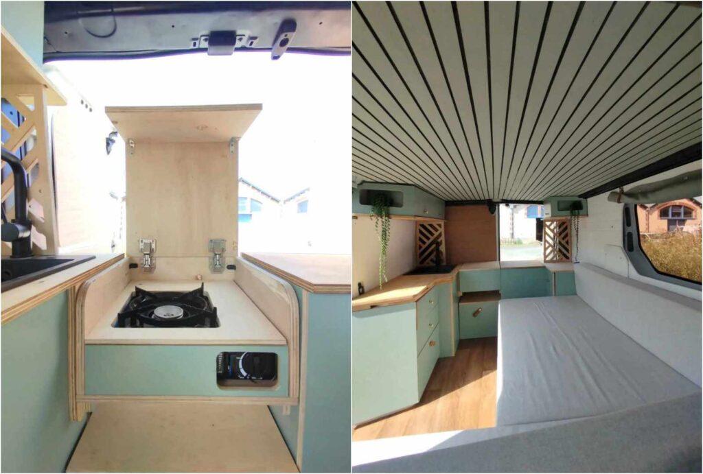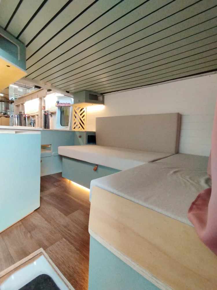 Son projet se nourrit d’une ambition : apporter un vent de fraîcheur dans l’univers du van. « En m’intéressant au secteur, je trouvais les intérieurs généralement froids, sans saveurs. Comme Marie Poppins qui déballe tout ce qu’elle a dans son sac à main, je voulais au contraire que ça soit surprenant et donne envie de voyager ». Le résultat est réussi : une table ingénieuse, pivotante et dépliable, comme dans les avions, une banquette convertible en lit deux places (208 x 123 cm), une cuisine réversible pour cuisiner dedans / dehors, un éclairage LED et une batterie Bluetti EB70 d’une capacité de 716 wh avec 2 branchements USB et 2 prises 220v. Il est si beau qu’on aimerait le garder en place… Son travail pourrait rejoindre celui de Vanille, mais à des tarifs plus accessibles : 12000 € l’aménagement, sans le véhicule. Actuellement, un modèle en vente à 26490€ tout compris, sur base Renault Trafic L1H1 de 2018.