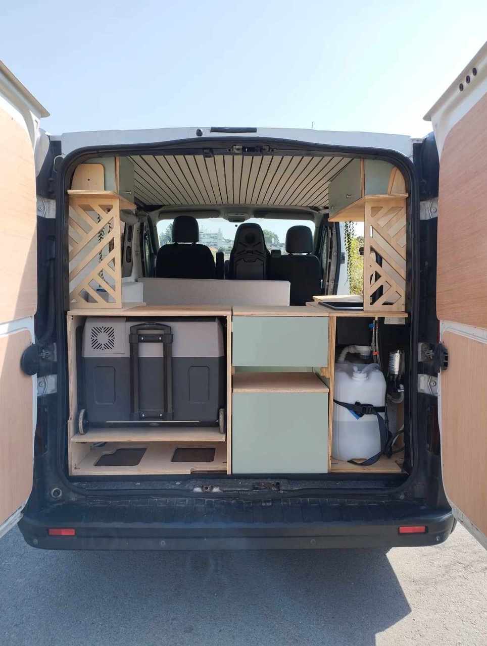 Son projet se nourrit d’une ambition : apporter un vent de fraîcheur dans l’univers du van. « En m’intéressant au secteur, je trouvais les intérieurs généralement froids, sans saveurs. Comme Marie Poppins qui déballe tout ce qu’elle a dans son sac à main, je voulais au contraire que ça soit surprenant et donne envie de voyager ». Le résultat est réussi : une table ingénieuse, pivotante et dépliable, comme dans les avions, une banquette convertible en lit deux places (208 x 123 cm), une cuisine réversible pour cuisiner dedans / dehors, un éclairage LED et une batterie Bluetti EB70 d’une capacité de 716 wh avec 2 branchements USB et 2 prises 220v. Il est si beau qu’on aimerait le garder en place… Son travail pourrait rejoindre celui de Vanille, mais à des tarifs plus accessibles : 12000 € l’aménagement, sans le véhicule. Actuellement, un modèle en vente à 26490€ tout compris, sur base Renault Trafic L1H1 de 2018.
