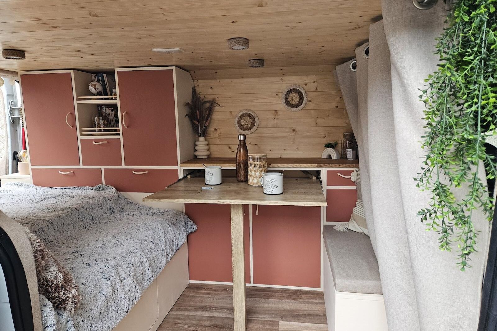 En quelques mois, la jeune artisane a déjà réalisé trois aménagements sur-mesure : deux sur Renault Trafic L1H1, un sur Peugeot Boxer L1H2. A chaque fois, elle puise son inspiration dans les tendances déco de l’habitat pour créer un univers chaleureux et source de bien-être. On le retrouve par exemple dans le choix des coloris de mobilier, naturels et réconfortants, ou au travers de l’accessoirisation (luminaires en guirlande, poignées de meuble en corde, etc.). Pour autant, pas question pour Maud de récréer une maison miniature.
