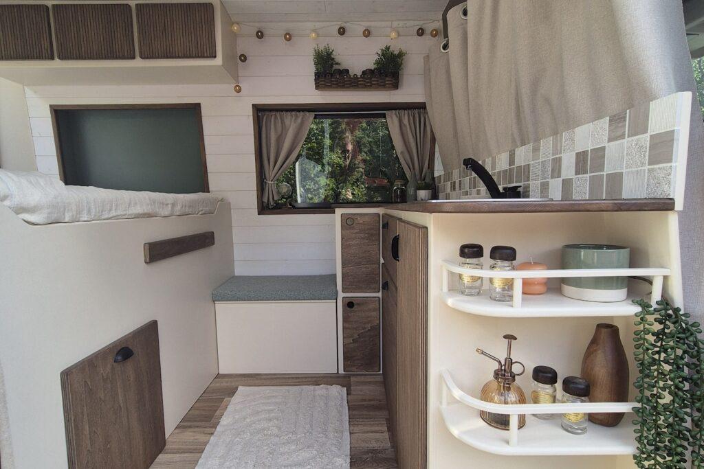 En quelques mois, la jeune artisane a déjà réalisé trois aménagements sur-mesure : deux sur Renault Trafic L1H1, un sur Peugeot Boxer L1H2. A chaque fois, elle puise son inspiration dans les tendances déco de l’habitat pour créer un univers chaleureux et source de bien-être. On le retrouve par exemple dans le choix des coloris de mobilier, naturels et réconfortants, ou au travers de l’accessoirisation (luminaires en guirlande, poignées de meuble en corde, etc.). Pour autant, pas question pour Maud de récréer une maison miniature.