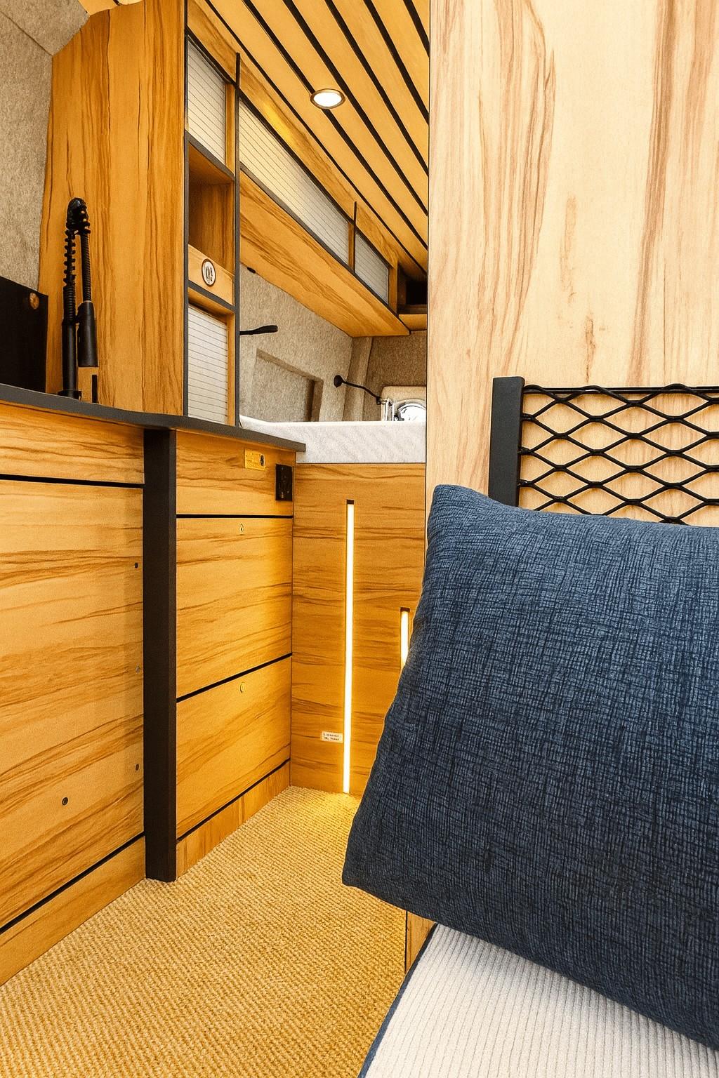 Pour ce VW Crafter, le client a opté pour un stratifié coloris miel ou « Cœur de pommier » et un décor bleu canard avec des nuances de gris.