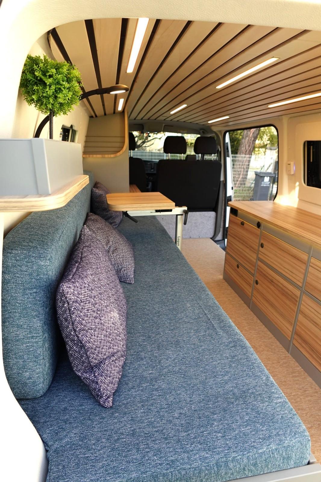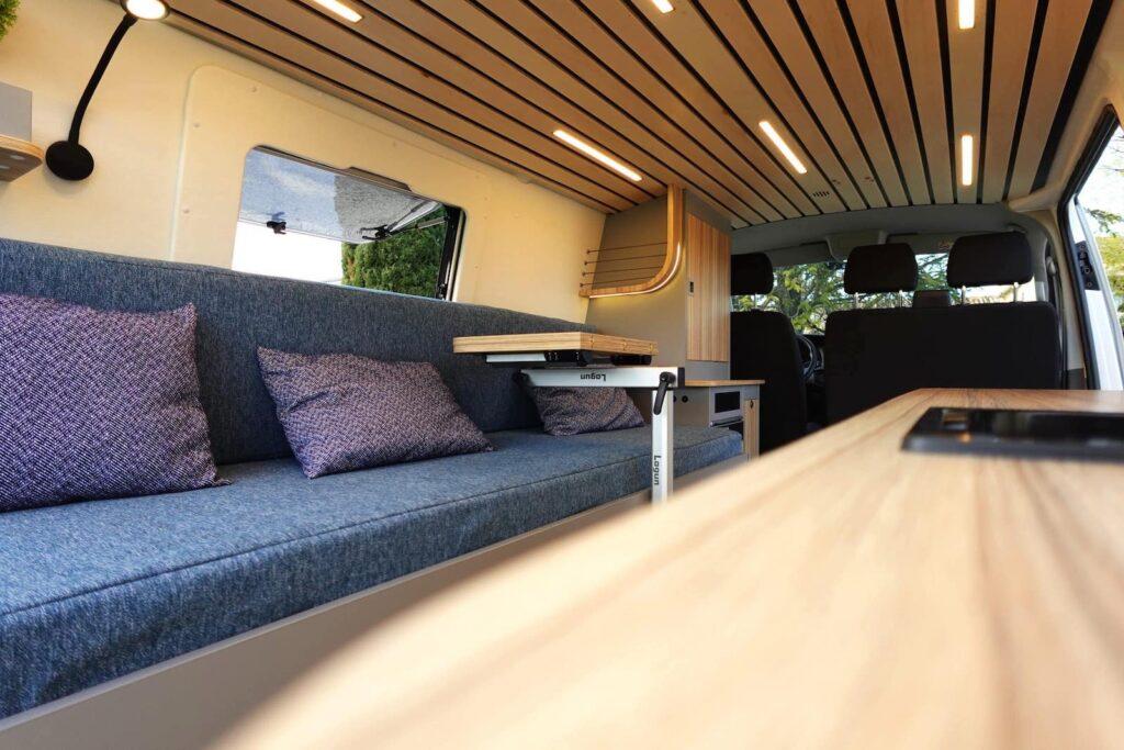 Sur ce VW T6, Inti Van a eu recours à un stratifié « Coco-bolo » associé à un décor gris clair.