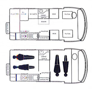 En partie arrière, la cuisine est disposée en long sur le côté droit comprenant un évier, un réchaud, un réfrigérateur, un chauffe-eau, une hotte aspirante et des placards de rangement ! Au fond, adossée à la cuisine, une penderie et dans la largeur restante, une banquette de 1,20 mètres. De l’autre côté, contre l’espace toilette, une nouvelle banquette plus étroite fait face à la banquette arrière. Entre elles, une table amovible vient alors constituer une deuxième dînette en alternance avec une configuration salon ou, après mise en place des éléments nécessaires, un deuxième couchage disposé cette fois-ci dans le sens de la longueur.